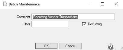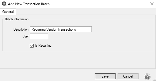 If you have multiple transactions (for various vendors) that you use every month (or every quarter or year), you can assign these individual transactions to a batch so that the entire group of transactions can easily be created when needed.