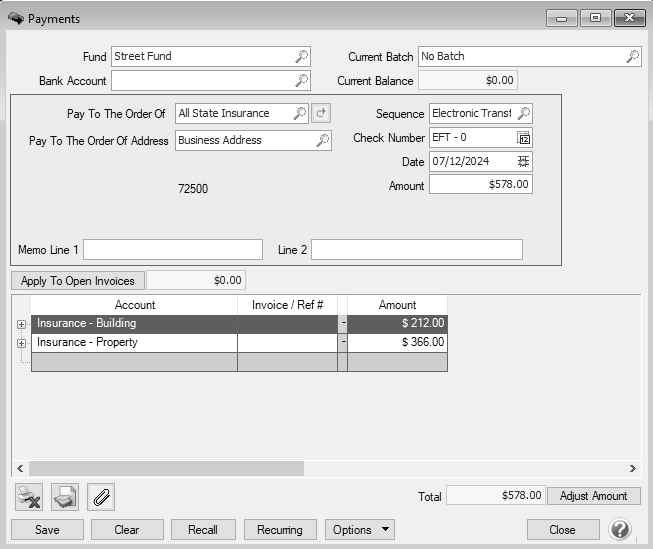 1. Once a transaction is marked as recurring, transaction entry becomes very efficient. When you would like to use the recurring transaction, simply select Processes > Purchases > Payments or Processes > Purchases > Vendor Invoices (A/P) to begin the transaction.