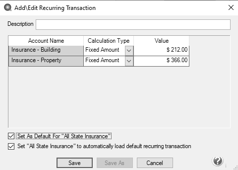 • Set As Default for " " should be selected if you'd like this recurring transaction assigned to this vendor. The transaction will then be available in the vendors list of recurring transactions. Normally you would want to select this option.