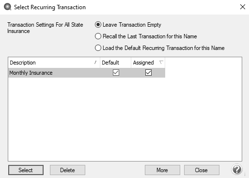 • Set " " to automatically load default recurring transactions should be selected if this is the only transaction that you enter for this vendor. When this option is selected, each time this vendor is selected in the transaction screen, the recurring transaction details will automatically be displayed. If you have multiple transactions that you enter for this vendor each month, then do not select this option. You will then need to manually select the transaction each time it's used.