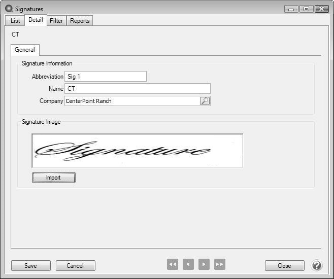 and select a company to assign the signature to or type a company to assign the signature to. - Click Import and select an image of the signature that has been previously scanned and saved as a BMP, GIF, ICO, JPG, PNG, WMF, TIF, TIFF, EMF or EXIF file type.