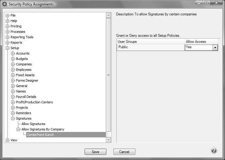 - Expand Setup > Signatures > Allow Signatures by Company. Highlight the company you are setting security for.